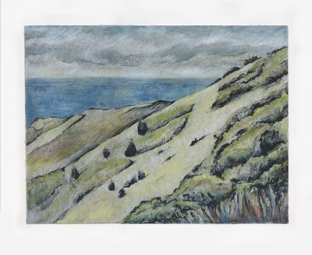 These artworks are a direct result of my experience outside in the rugged landscapes of the central coast of California. On-site sketches and photographs combined with my own recollections of various times of day moving through the landscape inform each piece’s palette and overall aesthetic. Interacting with places that are still far away, difficult to get to, wild and minimally touched by humans I find particularly appealing! I look to create a mood that interprets, not an exact location, but a memory of a specific time and place.